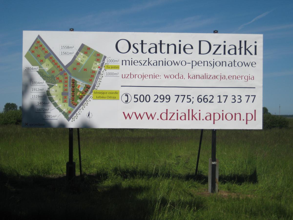 Teren naszych działek w Łebie - Żarnowskiej został oznakowany nową reklamą zewnętrzną! Zamieszczony na reklamie plan terenu pomoże Ci znaleźć działkę, którą jesteś zainteresowany.